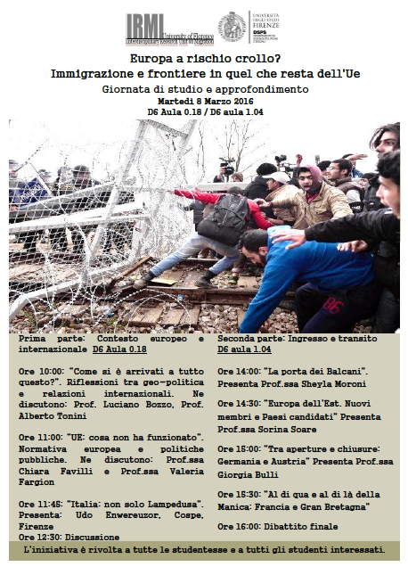 Martedì prossimo come Irmi (Interdisciplinary Research Unit on Migration) facciamo una giornata sul tema delle migrazioni e in particolare sulle migrazioni forzate (profughi, richiedenti asilo, etc.), in aula magna del D6. Sono coinvolti diversi docenti della Scuola. L'iniziativa è rivolta soprattutto agli studenti.